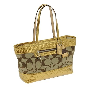 eye-catching design in Coach signature fabric, framed top and bottom with Liquid Gloss-a luxuriously quilted new material with the opulent look of lacquer. The interior is deep and spacious, and a zip-top closure keeps contents safely inside.